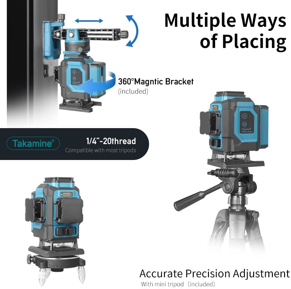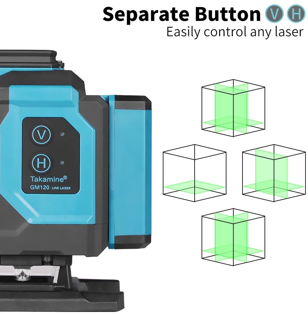 * 3 X 360° green laser line: Takamine GM120 laser level has 1 horizontal 360° plane (the lowest 1/2" horizontal line on the ground that can be knocked off the ground), 2 vertical 360° planes, 12 laser lines, which can cover the room Surrounding floors, walls and ceilings. The horizontal and vertical lines intersect at an angle of 90° to help you quickly visualize and complete the square layout